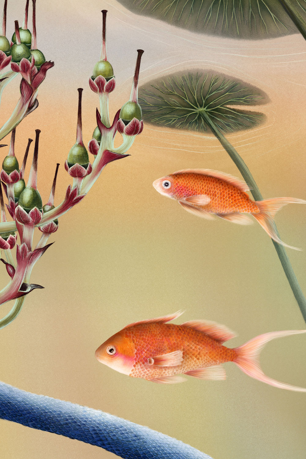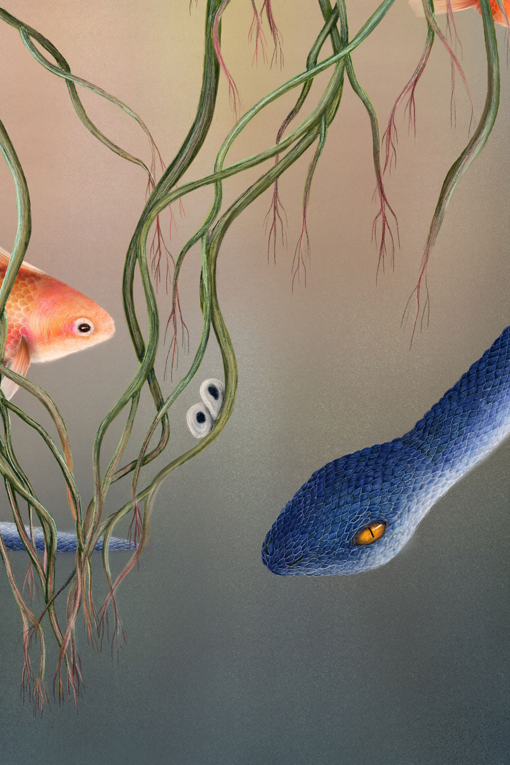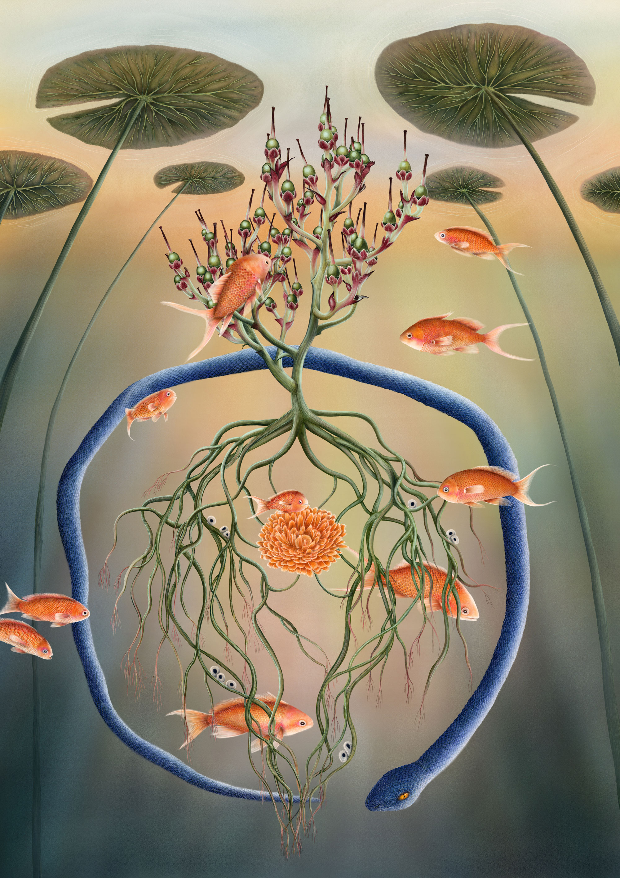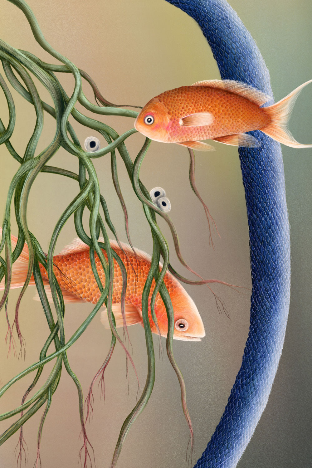 Fish represent beloved people and animals, the snake stands for death and farewell, and the fish eggs symbolize the future, the hope of meeting new beloved beings. Life and death exist side by side, intertwined in a quiet cycle. The plant at the center represents depth and a sense of safety, while the underwater atmosphere evokes a protected, peaceful space, a place of love, remembrance, and renewal.