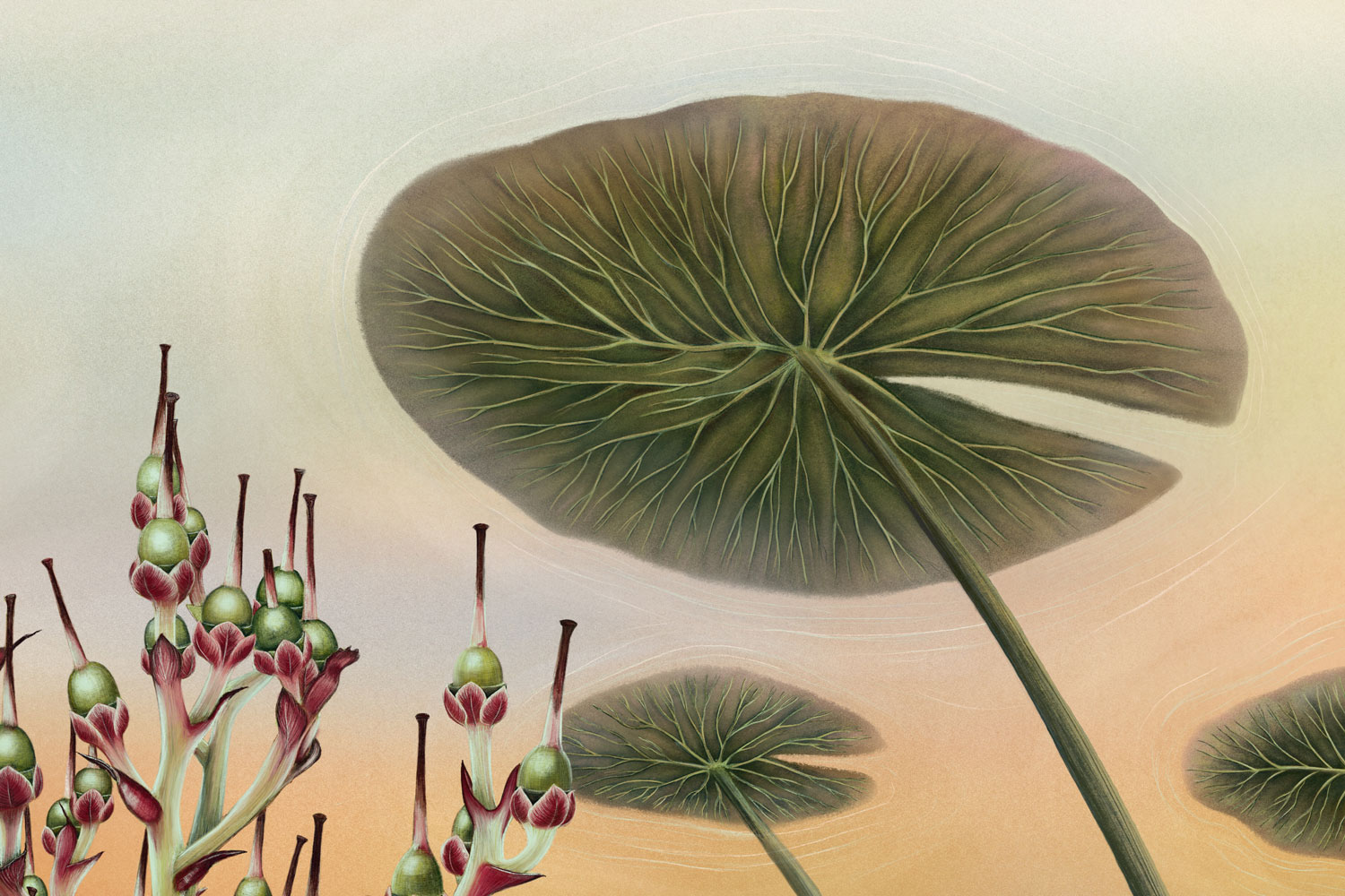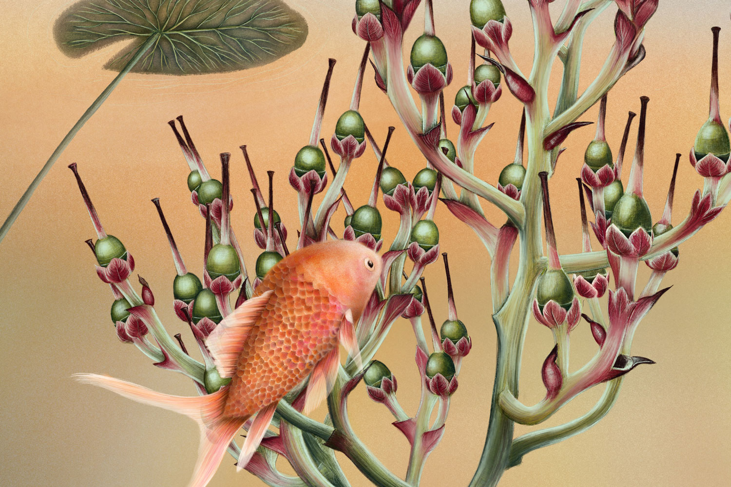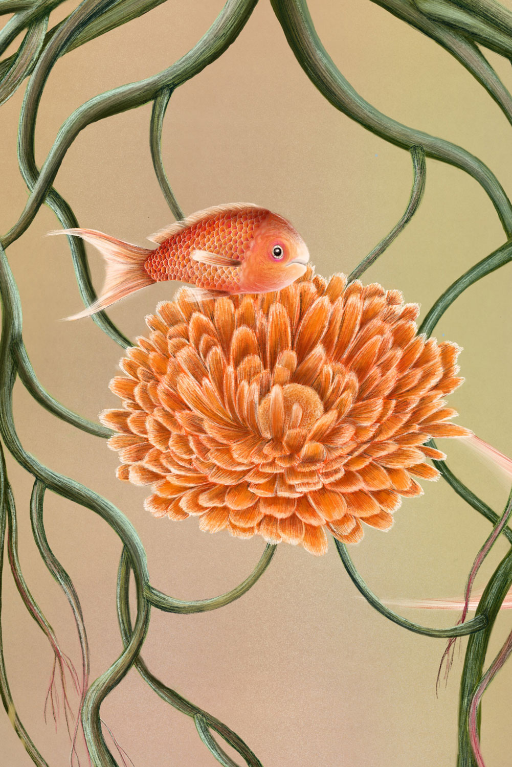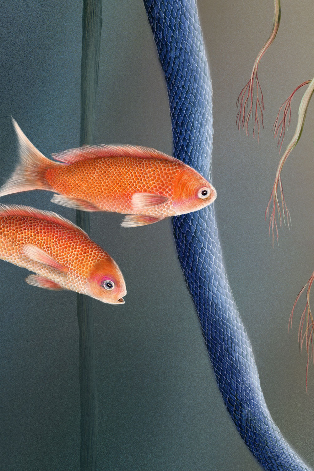 Fish represent beloved people and animals, the snake stands for death and farewell, and the fish eggs symbolize the future, the hope of meeting new beloved beings. Life and death exist side by side, intertwined in a quiet cycle. The plant at the center represents depth and a sense of safety, while the underwater atmosphere evokes a protected, peaceful space, a place of love, remembrance, and renewal.